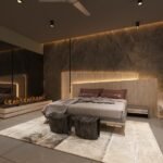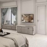 This elegant bedroom showcases a classic, refined aesthetic. The light color palette, featuring crisp whites and soft grays, makes the space feel spacious and serene. Intricate wall molding, mirrored furniture, and a detailed floor lamp add a touch of glamour. A charming window seat provides a cozy nook for reading, while the decorative art and clean lines maintain a sense of luxurious tranquility.