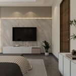 This image captures a serene and modern bedroom, emphasizing a harmonious connection with nature. The floor-to-ceiling windows on two sides bathe the room in natural light and offer expansive views of the outdoors. The color scheme is a sophisticated blend of grays and warm browns, with simple, clean-lined furniture that maintains a sense of calm. This design is perfect for anyone seeking a minimalist and peaceful sanctuary.