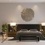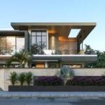This contemporary elevation design showcases a striking use of materials and geometric shapes. It combines the warm tones of travertine stone and wood accents with the cool, modern look of gray plaster and dark metal. The flat roof lines and cantilevered sections create a dynamic, layered facade, while the glass balcony railings ensure uninterrupted views, giving the home a sense of lightness and openness.